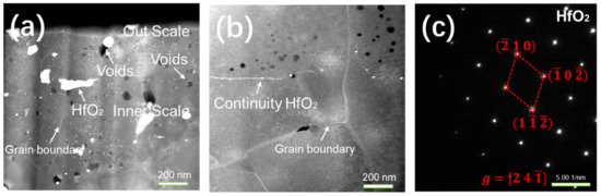 To explore the distribution of Hf in the grains of the alloy, the specimens were cut by FBI and the microscopic morphologies were observed, as shown in Figure 9. From the STEM images and the distribution of Hf at the grain boundaries, we could see that Hf had a larger atomic radius than O. The enrichment of Hf with a larger atomic radius at the grain boundaries could reduce the diffusion path of O to an extent and could also decrease the total energy of the alloy at high temperatures; thus, the energy of the system remained stable and the oxidation resistance of the alloy was improved. Furthermore, the STEM images showed that part of the Hf distribution at the grain boundaries was continuous, which ameliorated the bidirectional diffusion of Al and increased the density of the oxide scale.