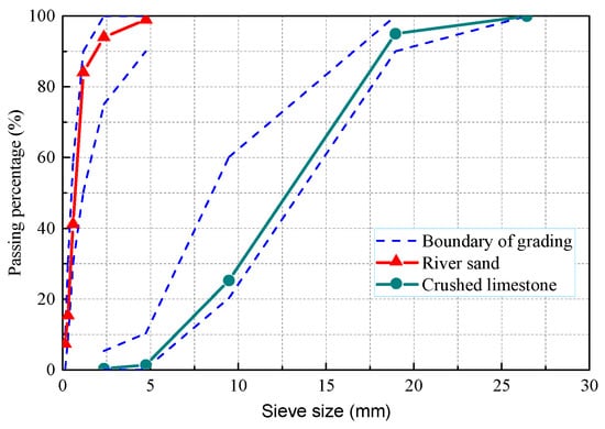 Ordinary Portland cement 42.5 was used in this study. The chemical compositions and physical properties are given in Table 1. The fine aggregate was natural river sand, with a fineness modulus of 2.71 and an apparent density of 2430 kg/m3. Crushed stone was used as a coarse aggregate, with a maximum particle size of 20 mm and an apparent density of 2680 kg/m3. The grading curves of the fine aggregate and coarse aggregate are shown in Figure 1. Their performance met the requirements of concrete.