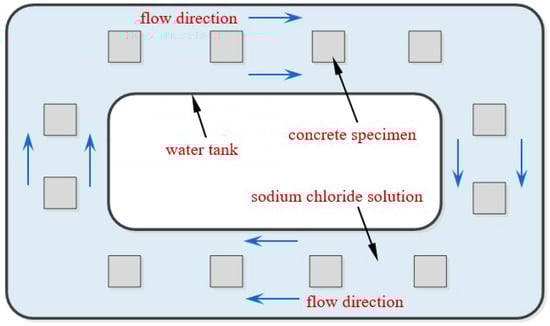 For the F-DW group, the specimens were placed in a sodium chloride solution tank with 48 h drying and 48 h wetting conditions. The exposure ages were set as 30, 60, 90, 120, and 150 days, respectively. The specimens in the flow chloride solution are shown in Figure 2. A water pump was used to make the sodium chloride solution flow, and the measured flow velocity was 1.2 m/s.