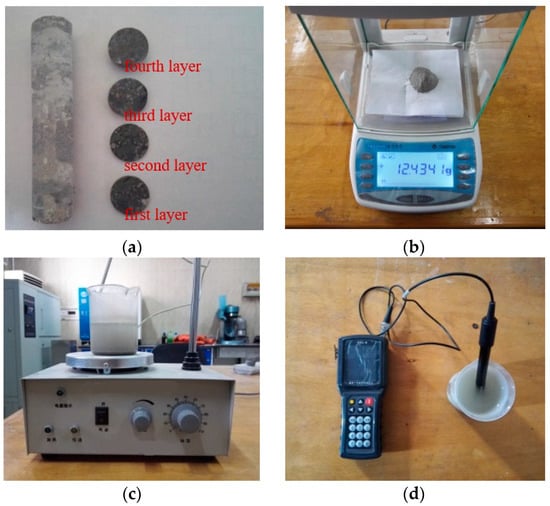 Test progress of chloride ion concentration: (a) core drilling and slicing; (b) weighing after grinding; (c) solution agitation; (d) concentration measurement.