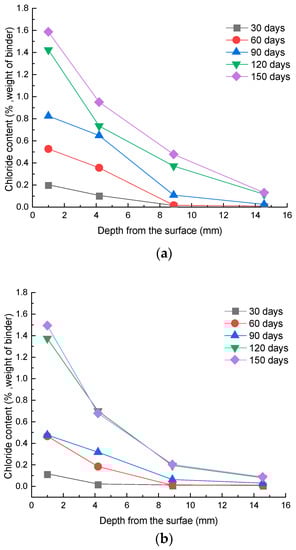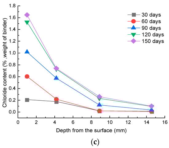 The distribution of chloride concentration for the concrete specimens under different exposure conditions is exhibited in Figure 4, with the exposure times of 30, 60, 90, 120, and 150 days. It can be seen that under each exposure condition, the chloride ion content decreased with an increase in the concrete depth. Furthermore, the content of chloride ions at the same depth increased with increasing exposure time. The results also indicated that the chloride ion content at a given depth increased rapidly in the early ages. Meanwhile, the chloride ion content increased more slowly after the exposure time of 120 days.