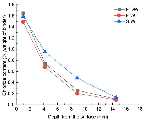 The profiles of invaded chloride ion content for specimens exposed to distinct corrosion conditions for the age duration of 150 days are shown in Figure 5. It can be seen from the test data that the chloride ion content under the long-term immersion condition of flowing solution (F-W) was lower than that under the long-term immersion condition (S-W), which implied that the flow of the chloride solution did not necessarily accelerate the invasion process of chloride ions in concrete. Moreover, compared with long-term immersion in flowing solution, the concentration of chloride ions was slightly higher in the same layer in concrete under the conditions of dry and wet circulation of flowing solution (F-DW); the results are similar to the findings of Xu’s research [19]. This may be due to the fact that under dry–wet cycles of the flowing solution, the water in the concrete evaporated through the capillary during the drying stage [32,33]. Thus, the humidity inside the concrete was reduced and the negative pressure of the pores enhanced, leading to an increase in the erosion of chloride ions.