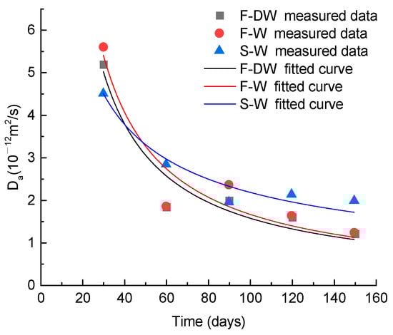 According to Figure 6, the value of Da decreases with the increase in exposure duration. As the cement hydration reaction proceeds, ettringite continuously forms in the pores of concrete, forming calcium silicate hydrate gels and calcium sulfur aluminate. Therefore, the original, relatively large-diameter or connected pores are gradually filled by the solid-phase products of these cement pastes, and the microstructure tends to be dense [37]. Thus, the diffusion coefficient of chloride ions decreases with time, which is consistent with the findings of existing studies [38]. Moreover, based on previous research [39,40,41,42], the diffusion coefficient of chloride ions is likely to vary with temperature, relative humidity, water flow, and other external factors. The apparent chloride diffusion coefficient Da varies for different exposure conditions through the analysis of experimental data. A power function [43,44,45] is adopted to fit the scatter plots of Da and exposure time, which can be expressed as follows: