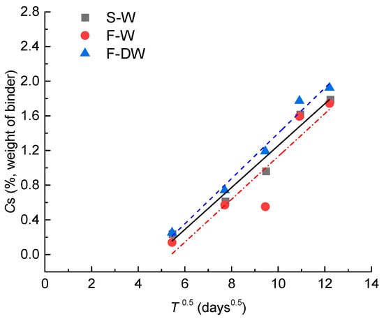 The surface chloride content Cs in Equation (1) is calculated by chloride diffusion coefficient D0 and the measured chloride concentration. Based on the data analysis, it is found that the surface chloride content increases with time. The surface chloride content over time can be expressed as