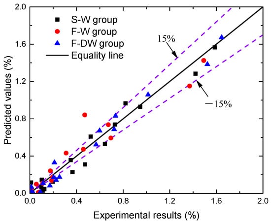 To verify the accuracy of the prediction model in Equation (4), the results of predicted and measured values are plotted in Figure 8. From Figure 8, it can be observed that most of the chloride content values calculated by the model are within a ±15% error margin in comparison to the experimental results, validating the reliability of the prediction model developed in this paper.