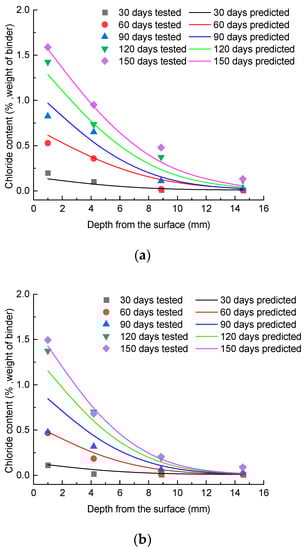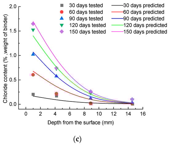 Figure 9 shows the predicted chloride content curves and the experimental data versus exposure duration time t (t = 30, 60, 90, 120, and 150 days) under different exposure conditions. It can be seen that the magnitude of the chloride content determined by the model agrees well with the experimental results, with the exception of some discrete data.