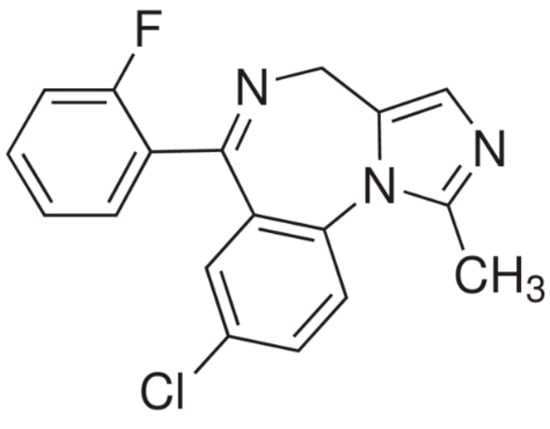 - Kanto, J.H. Midazolam: The First Water-soluble Benzodiazepine. Pharmacology, pharmacokinetics and efficacy in insomnia and anesthesia. Pharmacotherapy 1985, 5, 138–155. [Google Scholar] [CrossRef]