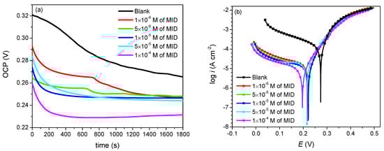 (a) Open circuit potential over time and (b) potentiodynamic polarization curves of copper in 0.1 M HNO3, in the absence and presence of different concentrations of MID.