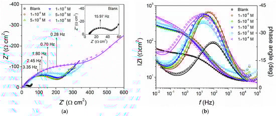 The shape of the Nyquist plots in Figure 3a is characterized by the presence of a high frequency semicircle, corresponding to the charge-transfer resistance (Rct) in parallel with the double-layer capacitance (Cdl), followed by a straight line at low frequencies, with a slope of approximately-1, related to a Warburg impedance, which describes a diffusion process. Literature data report that the diffusion process indicated by the Warburg impedance can be related to the diffusion of Cu2+ ions from the electrode surface to the bulk solution or to the diffusion of dissolved oxygen from the bulk to the interface [38]. Since the Warburg impedance does not disappear in the presence of MID, this indicates that, both in the presence and absence of MID, the corrosion of copper is under mixed control of both charge-transfer and diffusion processes. The diameter of the high frequency loop represents the Rct value, which obviously increases with MID concentration, indicating that charge-transfer is inhibited in the presence of MID. This is also evident from the shift of the characteristic frequency of the charge-transfer process to lower values with increasing MID concentration. The Bode plots presented in Figure 3b clearly evidence that the magnitude of impedance at low frequency increases almost one order of magnitude for the highest concentration of MID, as compared to the blank solution. Similarly, the phase angle in the presence of MID increases, and the frequency of the maximum shifts to lower values, confirming the inhibitor ability of MID.