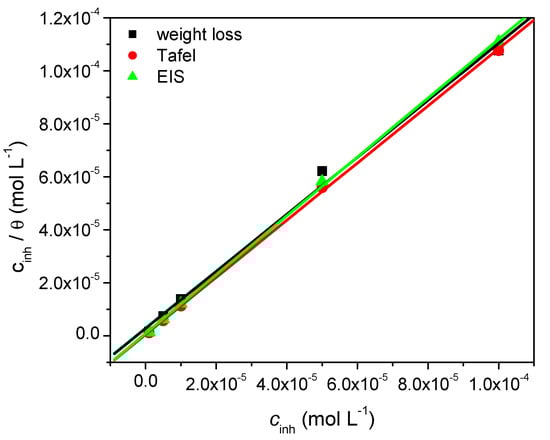 Figure 4 shows the linear dependence of cinh/θ versus cinh, obtained by using experimental data computed from weight loss, Tafel, and EIS measurements, respectively. In all cases a straight line is obtained, with correlation coefficient (R2) values above 0.99 and a slope closed to the unit. This is an evidence that the adsorption process of MID on copper surface obeys the Langmuir isotherm.