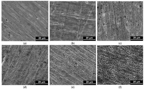 The surface morphology of copper samples was investigated using FE-SEM after 48 h of corrosive attack during the weight loss measurements. Figure 5a–e shows FE–SEM images of the copper surface in the presence of different concentrations of the inhibitor; and in Figure 5f, in the absence of the inhibitor.