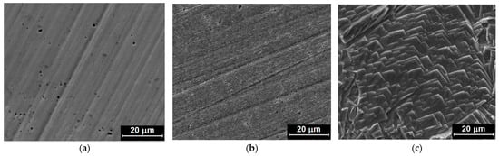 FE–SEM images of the copper surface: (a) before and after potentiodynamic polarization measurements in 0.1 M HNO3 solution with (b) 10−4 M MID and (c) without inhibitor.