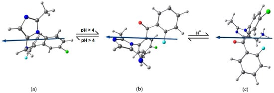 Optimized molecular structures of MID molecule in water: (a) closed-ring structure; (b) open-ring structure resulting by reversible hydrolysis in acid media; and (c) open-ring structure protonated at the free amino group. The arrow shows the orientation of the dipole moment. Atoms are depicted in: blue—nitrogen, green—chlorine, cyan—fluorine, red—oxygen, dark grey—carbon, light grey—hydrogen.