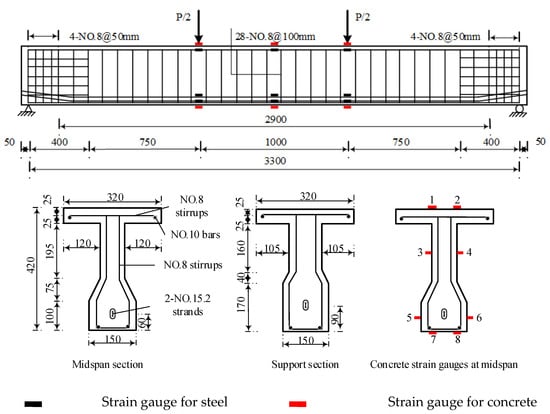 Standard 32 m prestressed concrete beams in heavy-haul railway were taken as the prototype, and five scale test model beams were designed. The geometry and reinforcement of the model beams are shown in Figure 1. Six concrete cubes and six prisms were taken as the test blocks for each test beam. The mixture proportions and type of concrete are shown in Table 1. The concrete strength was tested at three time periods, and the average compressive strength value was 53.6 MPa. Three 400 mm long samples were taken for each steel bar type to determine the mechanical properties of tensile steel bars and stirrups, as shown in Table 2. Two bundles of 7Φs5 steel strands (nominal diameter: 15.2 mm) were selected as prestressing steel bars with an ultimate tensile strength value of fpk = 1860 MPa and parabolic shape. The steel strands were tensioned at one end, and the concrete age had exceeded 28 days. The beam ends were equipped with reinforcement mesh, an embedded steel plate, and spiral reinforcement to withstand the local pressure. The anchor end of the model beam as shown in Figure 2. The prestress was divided into five levels and tensioned to 1436 MPa (controlled tensile stress is σcon = 1395 MPa). The initial prestress was about 77% of the ultimate tensile strength.