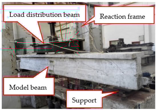 The test setup for the model beam is shown in Figure 3. The layout of the strain gauges on the tensile steel bars and prestressed steel strands is shown in Figure 1. During static loading and unloading after fatigue cycles, three displacement sensors were used to measure the displacement of the test beams at the midspan and the loading points. Two displacement sensors were used to measure the support settlement of the test beams. When cracks were found in the beams, statistics were obtained on their width, length, and position.