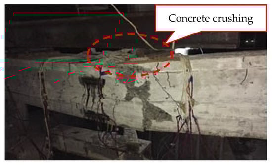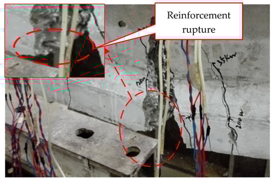 The model beams test showed that when the fatigue load level was lower than the pre-compression stress of concrete in the tension zone, the test beams exhibited excellent fatigue performance. With the increase in fatigue load level, the fatigue damage characteristics of the test beams were similar to those of partially prestressed concrete beams with a high prestressing degree [21]. The fatigue failure of those of test beams occurred in the bottom tensile steel bar. Further loading caused the height and width of the main fatigue crack to increase rapidly, and the fatigue fracture of the remaining ordinary steel bar occurred successively. At this stage, the fatigue failure of prestressing strand and concrete in the compression zone did not occur (their average maximum strains are less than 1000 µε and 9000 µε, respectively). However, there were many vertical cracks in the pure flexural segment of the beams, and the deformation of the beams increased sharply. Consequently, the maximum crack width and deformation could not meet the requirements of the specification. The fatigue failure mode of the beam is shown in Figure 7. Therefore, it is more reasonable to take the number of fatigue fracture cycles of the bottom tensile steel bars as the fatigue life of the beams.
