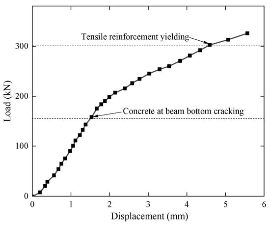 The tensile steel bar of the test beam S1 under static loading yielded first. Then, the concrete in the compression zone began to crush. The collapse of the mode beam was governed by concrete crushing, and the failure mode is shown in Figure 4. When the concrete at beam bottom cracked, and the concrete at beam top crushed after tensile steel bar yield, the applied loads were 157.0 kN and 324.2 kN, respectively. Figure 5 shows the load-midspan displacement curve of the test beam S1 under static loading. The load-strain curves of concrete in the compression zone, prestressing strand, and tensile steel bar are shown in Figure 6, where a negative strain indicates compression, and a positive strain indicates tension.