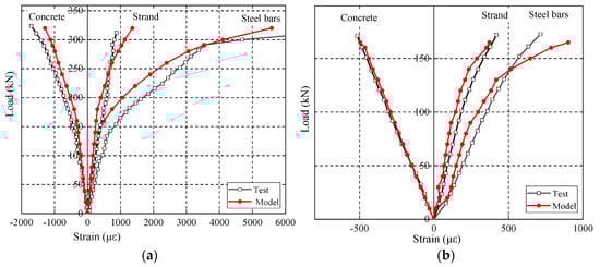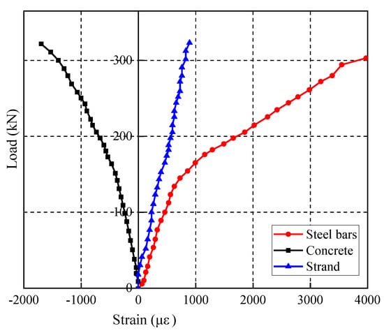 It should be noted that after the prestressing strands were tensioned, the strain of the prestressing strand in the midspan of the beam is about 4762 με, the strain of the tensile steel bars at the bottom of the beam is about −342 με. Then, the high-pressure grouting pump is used to grout and seal from the reserved grouting port. Due to the reasons for construction, some strain gauges of steel bar and prestressing strand were damaged before or at the beginning of the test. Therefore, in the result analysis, the undamaged strain data in the flexural segment were selected as far as possible. The strain of the concrete compression zone was given by strain gauge 1 illustrated in Figure 1. In the midspan of the beam, the strain of the prestressed steel strand was given by the outermost prestressed steel strand and the strain of the steel bar was given by the outermost tensile steel bar at the bottom. The influence of effective prestress and weight of the test beam was not considered before static loading, and the initial strain and the initial displacement were zeroed. It can be seen from the figure and the test phenomenon that after the concrete at beam bottom cracked, the increase rate of strain and midspan displacement of the test beam all increased significantly. When the applied load was 300 kN, the strain of the tensile steel bar changed abruptly; when the applied load reached 324 kN, the concrete in the compression zone was crushed.