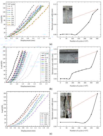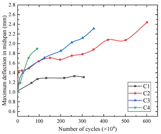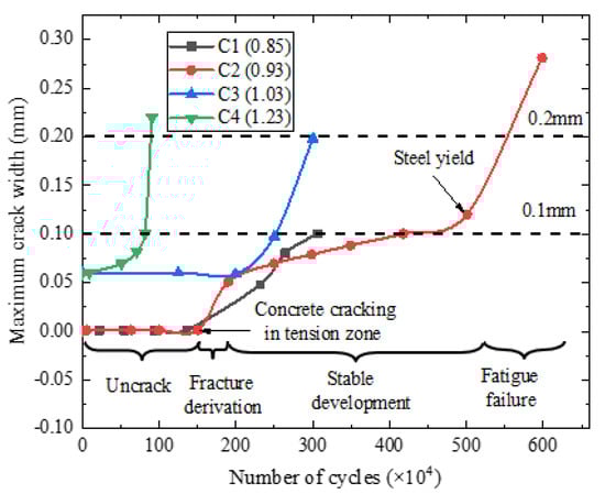 The relationship between the number of fatigue cycles and midspan displacement of the beams is shown in Figure 10, and the relationship between the number of fatigue cycles and the fatigue main crack width is shown in Figure 11. The average increase speed of midspan displacement is defined as y/n (unit: ×10−6), where y/n is the ratio of midspan displacement y (unit: mm) and the number of cycles n. The fatigue crack limit state is a critical indicator of prestressed concrete structures. It can be seen from Figure 10 and Figure 11 that when the cracking coefficients of the test beams were 0.93, 1.03, and 1.23, the fatigue loading cycles were 4.17 million, 2.6 million, and 0.81 million, respectively. Moreover, the maximum crack width reached 0.10 mm, exceeding the limit value specified in the Chinese standard GB 50010-2015 [25]. It indicates that prestressed concrete beams reached the fatigue crack limit state. The corresponding maximum displacements were 2.079 mm, 2.043 mm, and 1.862 mm. The maximum displacement and span ratio was 1/1772, which is less than the limit (1/800) specified in the code [26]. Before entering the fatigue failure stage, the average increase rates of the midspan displacement of the test beams C2, C3, and C4 were 0.498, 0.786, and 2.298, respectively. By comparison, it can be inferred that the higher the load level, the faster the stiffness degradation of the beams.