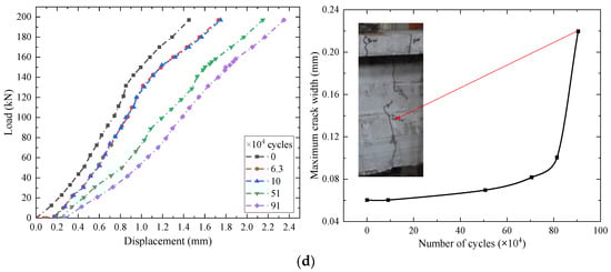 Figure 8 shows the relationship curves between the maximum crack width and the number of fatigue cycles of C1–C4 test beams. It can be seen from the figure that during the fatigue process, the crack development process had three stages: derivative stage, gradual development stage, and fatigue failure stage. The crack width in the derivative stage was about 0 mm–0.06 mm. In the gradual development stage, during the fatigue loading process, the number, length, and width of cracks in the pure flexural segment of the beams were constantly developing (see Figure 9). The number shown in Figure 9 represents the loading cycles (unit: ×104) and main crack width (unit: mm). For instance, 249.61 (0.09) indicates that the main crack (red crack) of the test beam C3 width is 0.09 mm after 249.61 × 104 fatigue cycles, and the main crack width in the gradual development stage was about 0.06–0.10 mm. When the maximum crack width of the test beams C2, C3, and C4 reached 0.10 mm, the corresponding fatigue cycles were 4.17 million cycles, 2.6 million cycles, and 0.81 million cycles, respectively. Throughout the whole fatigue test, the damage of the test beams accumulated, and the cracks expanded due to cyclic creep. When the stress of the bottom tensile steel bar reached the yield point, the displacement of the beams and the width of the main crack increased rapidly with the fatigue cycles, which eventually led to the fatigue failure. Compared with partially prestressed concrete beams [21], fully prestressed concrete beams are equipped with only a small amount of tensile steel bars, which is more sensitive to cracks. Once cracked, the bottom tensile steel bars of the beam can easily undergo fatigue failure. Hence, the cracking of fully prestressed concrete beams should be strictly controlled.