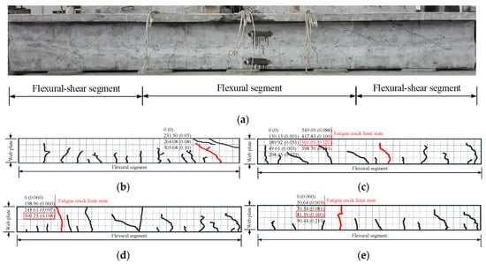 Crack distributions of the test beams (unit: mm): (a) General view (C1); (b) The test beam C1; (c) The test beam C2; (d) The test beam C3; (e) The test beam C4.