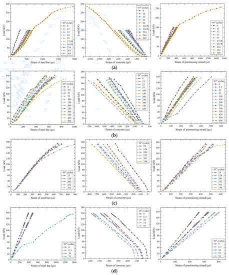 The load-strain curves of concrete in the compression zone, prestressing strand, and tensile steel bar of the beam are shown in Figure 12, where a negative strain indicates compression and a positive strain indicates tension. The strain of the concrete compression zone was given by strain gauge 1 illustrated in Figure 1. In the midspan of the beam, the strain of the prestressed steel strand was given by the outermost prestressed steel strand and the strain of the steel bar was given by the outermost tensile steel bar at the bottom. The effect of effective prestress and weight of test beam on the initial strain of concrete before testing was considered, the initial value of each load–strain curve of steel bar and the prestressing strand was zeroed. The test results show that with an increasing number of fatigue cycles, the residual strain of compression zone concrete increases gradually and the slope of the load-strain curves decreases continuously. In addition, it can also be observed that the slope of load–strain curves of tensile steel bar and the prestressing strand was continuously decreasing. Due to the damage of strain gauge, parts of strain data in the final stage of fatigue were not obtained.