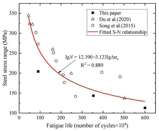 It can be seen from the above analysis that the fatigue failure of prestressed concrete beams occurs in the outermost tensile steel bars. Table 3 lists the fatigue life of the test beams under various fatigue load levels, and Figure 13 shows the fatigue stress amplitude and the fatigue life data points of the bottom tensile steel bars of the test beams within the fatigue loading range. An S-N curve was regressed using the experimental data points and the existing research data of similar cases [21,27]. Chinese standard TB 10092-2017 [28] defines that the stress range corresponding to 2 million cycles under constant amplitude cyclic loading is the fatigue strength in the S-N curve. The allowable fatigue stress amplitude for steel bars is 195.106 MPa, ensuring that the fatigue life is greater than 2 million cycles.