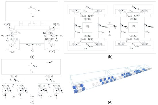 The vibration model of heavy-haul vehicle: (a) Front view of a vehicle; (b) Top view of a vehicle; (c) Side view of a vehicle (unit: m); (d) The finite element model of the heavy-haul train.