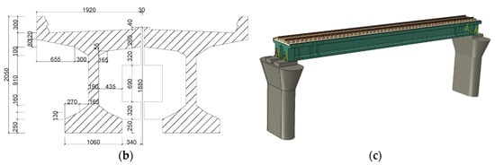 The finite element analysis model of the track-bridge: (a) The vehicle-rail-bridge system coupling model; (b) The cross-sectional form (unit: mm); (c) The finite element model.