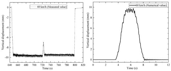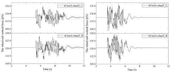 The wheel-rail force time-history curves under different axle weights and operating speeds can be obtained through the vehicle-bridge coupling simulation calculation. Taking the second wheelset of the front bogie of the first train as an example, the vertical time-history force of wheel-rail is shown in Figure 20, when the train with 25 t axle weight passed through 32 m standard height prestressed concrete beam at speeds of 40 km/h and 60 km/h. Through the analysis step (4) in Section 3.1, the calculated stress amplitudes values of tensile reinforcement in the prestressed concrete beam were 45.93 MPa, 51.44 MPa, 55.11 MPa, and 60.62 MPa, when the train axle weights were 25 t, 28 t, 30 t, and 33 t, respectively. This can be used to determine the load of fatigue test analysis.