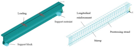 - The finite element model of prestressed concrete beams was established. The material parameters of concrete, prestressing strand, tensile steel bars, and stirrups were input. The material parameters were consistent with the test beams.