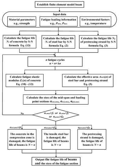 - The damage of prestressed concrete beam was assessed by whether the concrete in the compression area, prestressing strand, and tensile steel bars reached the ultimate strength, i.e.,Yes: the fatigue life of prestressed concrete beams N = n.No: n = n + Δn, return to step (4) and continue calculation.