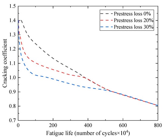 The effect of the fatigue load level on the fatigue life of the beams is shown in Figure 24, where the cracking coefficient is the ratio of the maximum fatigue load to the cracking load. When the prestress loss was 0%, the cracking coefficient was 0.9, and the fatigue life of the beams was 5.44 million cycles. When the cracking coefficient increased from 0.9 to 1.03 and 1.13, the fatigue life values of the beams were 3.46 million cycles and 2.05 million cycles, respectively, which were reduced by 36.39% and 62.32%. The effect of prestress loss on the cracking load of the beams was not considered, and only the effect of prestress loss on the fatigue life of the beams under the same load level was analyzed. When prestress loss increased by 20%, and the cracking coefficient increased from 0.9 to 1.03 and 1.13, the fatigue life values of the beams were 2.66 million cycles and 0.65 million cycles, respectively, which were reduced by 51.10% and 88.05%. When prestress loss increased by 30%, and the cracking coefficient increased from 0.9 to 1.03 and 1.13, the fatigue life of the beams was 0.78 million cycles and 0.24 million cycles, respectively, which were reduced by 85.66% and 95.58%. When the maximum fatigue load exceeded the cracking load of the beam, the crack resistance of the fully prestressed concrete beam was poor, and the fatigue life of the beam decreased significantly with the increase in the fatigue load level and prestress loss. It can also be seen from the figure that when the maximum fatigue load was less than the cracking load, the prestress loss did not affect the fatigue life of the beam. This indicates that when the beam was not cracked, the prestressed concrete beam showed good fatigue performance, and the degree of prestressing had no effect on the fatigue life.