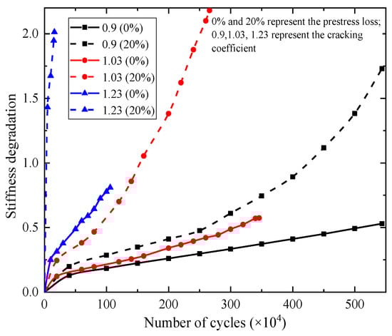 The effects of the fatigue load levels and prestress loss on stiffness degradation of the beams are shown in Figure 25, where stiffness degradation coefficient is defined as α = (fn−f0)/f0, f0 is the midspan displacement before fatigue loading, and fn is the midspan displacement after n fatigue cycles. When prestress loss was 0%, the cracking coefficient was 0.9, and the stiffness degradation degrees of the beams were 30%, 40%, and 50%, the corresponding fatigue cycles were 2.54 million cycles, 3.86 million cycles, and 5.10 million cycles, respectively. When the cracking coefficient increased from 0.9 to 1.03, the corresponding fatigue cycles were 1.73 million cycles, 2.44 million cycles, and 3.07 million cycles, respectively. When the cracking coefficient increased from 0.9 to 1.03 and prestress loss increased by 20%, the corresponding fatigue cycles were 0.36 million cycles, 0.64 million cycles, and 0.86 million cycles, respectively. The results show that the increase in the fatigue load level of the beams accelerated the stiffness degradation. The higher the degree of stiffness degradation, the more pronounced the influence of the fatigue load level on the stiffness. The concrete in the tension zone and tension steel bar gradually withdraw from work because of the accumulative fatigue damage. The fatigue capacity of the beams was borne mainly by the prestressing strand and the concrete in the compression zone. Prestress loss in the beams accelerated the degradation rate of the fatigue strength and reduced the fatigue life. The higher the fatigue damage degree, the more pronounced the effect of prestress loss on the fatigue life of the beams.