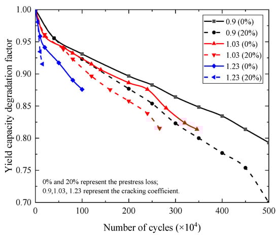 The impact of the fatigue load level on the yield capacity degradation of the beams is shown in Figure 26. The yield capacity degradation coefficient is defined as αy = 1−(P0−Pn)/P0, where P0 is the yield capacity of the beams before fatigue loading and Pn is the yield capacity after the beam is loaded for n times. It can be seen from the figure that the yield capacity degradation law of the beams was the same as that of the stiffness degradation. When prestress loss was 0%, the cracking coefficient was 0.9, and the yield capacity degradation values of the beams were 5%, 10%, and 15%, the corresponding fatigue cycles were 0.54 million, 1.90 million, and 3.45 million, respectively. When the cracking coefficient increased from 0.9 to 1.03, the corresponding fatigue cycles were 0.40 million, 1.59 million, and 2.76 million, respectively. When the cracking coefficient increased from 0.9 to 1.03 and prestress loss increased by 20%, the corresponding fatigue cycles were 0.40 million, 1.14 million, and 2.16 million, respectively. The results show that the increase in the fatigue load level and prestress loss in the beams accelerated the degradation rate of yield capacity. The higher the degree of yield capacity degradation, the more pronounced influence of the fatigue load level and prestress loss on the yield capacity.