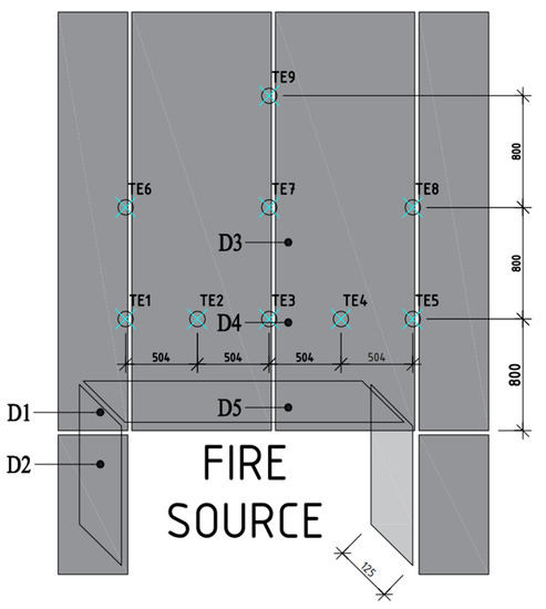 The façade cladding analysed in this paper, installed on the real model, was made of 8 mm-thick fibre cement boards of natural colour, i.e., not dyed in the mass. It was mounted with mechanical connections to an aluminium substructure. The substructure consisted of metal vertical profiles mounted mechanically via brackets to the ground. There was a fire coming out of the combustion chamber, which was affecting the façade with high temperatures, realising the scenario of a fire in the room spreading through the window opening to the façade. A ventilation device was placed in the combustion chamber on the rear wall, which allowed the reproduction of a real fire situation. The division of the façade into cladding panels and the location of thermocouples and sampling sites are shown in Figure 3. The dimensions of the actual large-scale façade model were ~3 m × 3.5 m, and it was attached to a wall made of autoclaved aerated concrete, 600 kg/m3 variety, with dimensions of 3.98 m × 3.98 m.