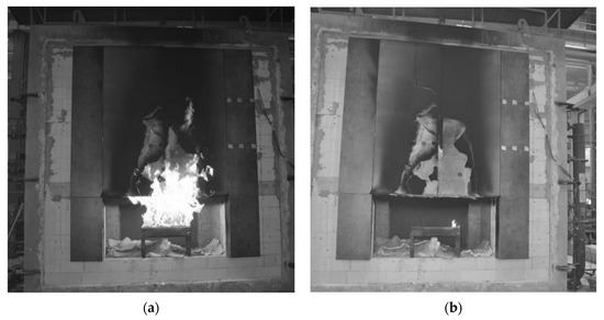 In the dispersed phase, cellulose fibres, PVA synthetic fibres and PP fibres are used in fibre cement boards. The individual fibres have the following melting points: synthetic fibres PVA (polyvinyl alcohol)—about 200–220 °C [14,15]; PP (polypropylene) fibres—about 175 °C [14,16]; cellulose fibres—260–270 °C [17]. In the case of fibre cement boards, there is a lack of knowledge about the behaviour of this composite and how it degrades at fire temperatures. Most of the scientific literature analysing fibre cement boards focuses on the production process, its possible subsequent optimisation in terms of fibres and the testing of its basic physical properties. One of the few examples is the study presented in [18], where it has been shown that fibres in fibre cement boards degrade at 230 °C only after approx. 3 h of exposure. Damage to such degraded boards, during a three-point bending test, occurs through high-energy brittle fracture. It is noticeable that for fibre-reinforced cement composites, the modulus of rupture rises as the temperature increases up to about 300 °C [19] in a short period of time. It is, therefore, reasonable to believe that such temperatures are safe for these boards over the short term. Destruction of the fibres and cement matrix at a temperature of around 300 °C only occurs after a long period of time. This is influenced by the protection (encapsulation) of the fibres by the matrix phase (cement or concrete). These temperatures correspond approximately to the melting point of cellulose fibres. Szymków carried out tests on fibre cement board samples at 400 °C [18]. The samples showed much less stability at this temperature and degraded at a faster rate. The results exhibited large discrepancies because, depending on the manufacturer, the ingredients and the manufacturing technology, some samples “lasted” a maximum of several minutes while, while others were destroyed during the test.