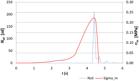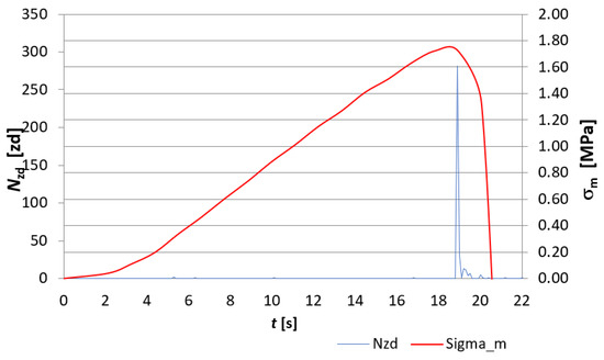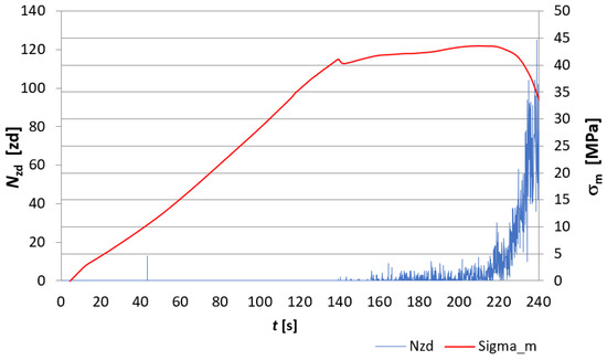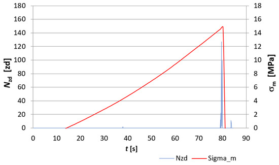 The evaluation of the destruction of fibre-cement board structures under the influence of fire was made through the analysis of EA signals recorded during the course of the three-point bending test and was based on EA descriptors such as the number of events Nzd and the sum of events ∑Nzd. Figure 7, Figure 8, Figure 9 and Figure 10 show a recording of the event rate Nzd and bending stress σm versus time for selected samples designated D3, D4, D5 and, for comparison, an untreated reference board. Table 1 summarises the resulting modulus of rupture (MOR) values and ∑Nzd event sum values for the tested samples.