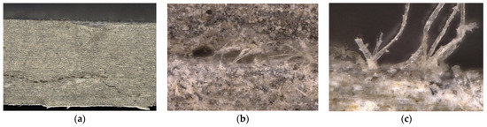 View of the reference sample under a digital microscope: (a) magnification ×20, (b) magnification ×150, (c) magnification ×400.