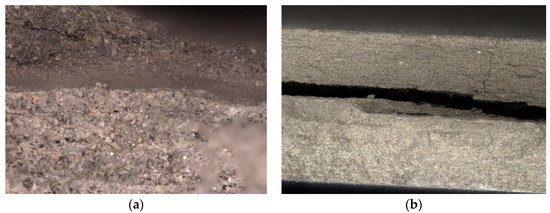 Figure 12 shows a view of the sample D5 fracture after the three-point bending test. A change in the structure of the board could be seen through the precipitation of individual cement matrix materials (known as crystallisation) and the delamination of the fibre cement board. Delamination was caused by the temperature gradient between the outer surface and the inner surface (mounted from the platform) and the total thermal expansion of the material. In addition, complete pyrolysis of the fibres could be seen—caverns and voids left after the melting of the fibres (Figure 12b). The fracture shape was straight, which indicated that it followed the shortest line. From this figure, it is clear that the sample was completely destroyed.