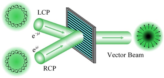 The spatial SOPs of a vector beam, unlike homogeneously polarized beams, may be flexibly adjusted to the desired distribution. According to the polarization interferometry, the phase retardation between two orthogonally circularly polarized (left circular polarization, LCP, and right circular polarization, RCP) scalar beams with inverse phase profiles can be utilized to regulate SOPs distribution of the interference pattern, generating a space-variant linearly polarized beam, as shown in Figure 1. More generally, if the phase retardation at each location of the two orthogonally circularly polarized beams is modified freely, an interference pattern with any predetermined SOPs distribution will be configurated for generating arbitrary vector beams. It is also a practicable approach to arrange a common path interferometric configuration assisted by a 4-f system and an SLM. The experimental setup is shown in Figure 2.