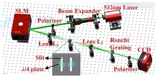 Firstly, a 532 nm collimated laser beam, passing through a linear polarizer in the x direction, illuminates a reflective liquid crystal SLM which is equipped with 1920 × 1080 pixels (each pixel has an 8 μm × 8 μm size). Here the diameter of the collimated laser beam has been enlarged by the beam expander to match the panel window size of the SLM. In the 4-f system, composed of a pair of identical lenses (L1 and L2) with the same focal length of f, SLM and Ronchi phase grating are placed at the front focal plane of L1 and the rear focal plane of L2, respectively. The rear focal plane of L1 and the front focal plane of L2 overlap at the middle plane of the 4-f system, which is known as the Fourier plane of the 4-f system. Secondly, the incident linearly polarized beam is diffracted into various diffraction orders by a predetermined holographic grating (HG) displayed at the SLM. A spatial filter with two separate slits is placed at the Fourier plane to only let the beams with ±1-orders pass through. Two λ/4 plates with long axes perpendicular to each other are located immediately behind the two slits, converting the beams with ±1-orders into left and right circularly polarized beams, respectively. The inset in Figure 2 shows the real setup of the two slits of the spatial filter and the two λ/4 plates. The short black lines denote the long axes orientations of the two λ/4 plates. Then, the left and right circularly polarized beams are recombined into a space-variant linearly polarized beam at the Ronchi phase grating, which is inserted at the rear focal plane of L2, based on the polarization interferometry. The two circularly polarized beams can interfere at the Ronchi phase grating that enable a coaxial and collimated vector beam. The period of the HG is adjusted to the same as that of the Ronchi phase grating in this case. To calibrate the optical path difference between the two combined beams, a detailed explanation is necessary. When the linearly polarized beam in the x direction illuminates the SLM, the beam with 0-order of the reflected beams is not endowed with additional phase factor. We utilize the beam with 0-order as a standard reference beam to examine the collimation of optical path of the 4-f system, because the collimation of optical path enables no additional optical path difference introduced. Here we adjust frequently the optical path until the output beam with 0-order becomes collimated, with the help of a shear interferometer. After that, we continue to fine-tune the optical path to ensure that the diameters of the two beams with ±1-orders are the same, which indicates that the optical path difference of the two beams has been compensated. Finally, a color Charge Coupled Device (CCD) is positioned behind the Ronchi phase grating to receive generated vector beams.