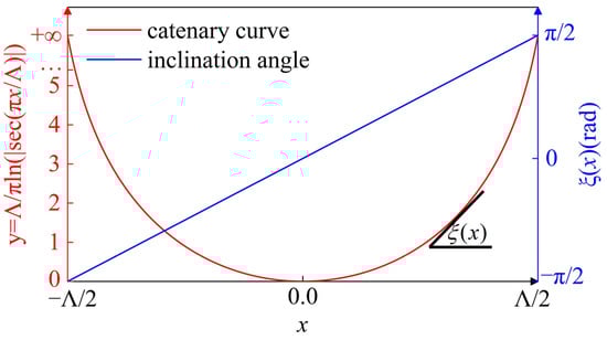 where Λ is the horizontal length of a single catenary. Recently, the catenary was applied to optics [44], and a new area called Catenary Optics has formed [45]. As we know, although phase is controlled by an optical path difference in optics and photonics, there is a common and alternative phase control scheme in the subwavelength optics: the geometric phase shift. For example, geometric phase subwavelength elements can achieve geometric phase shift by the rotation angle of a nanostructure. When the nanostructure is catenary-shaped, it can be considered as a continuous catenary structure consisting of many small nanostructures. We show a schematic of the catenary curve and the inclination angle of its tangent in a two-dimensional coordinate system, as shown in Figure 3.