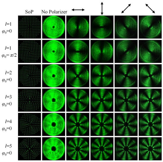 Firstly, we examine the generation of the vector beams in the helical phase with different topological charges l, as shown in Figure 4. In particular, there are two very representative vector beams for l = 1, RP beam and AP beam, corresponding to the initial phases φ0 of 0 and π/2, respectively. Evidently, we cannot distinguish the difference between the vector beam and the scalar beam from the intensity patterns when no polarizer is inserted. Different from intensity fringes of the conventional interference pattern of two identically polarized beams, the polarization interference pattern of two orthogonally polarized beams has no intensity fringes. However, we can identify two vector beams by the distribution of their SOPs, which is the essential difference between two interference patterns. Therefore, it is necessary to insert polarizers with different orientations to examine SOPs of different vector beams. Here, we employ four polarizers with horizontal, vertical, and 45° and 135° orientations. When a polarizer is inserted, the intensity patterns of the vector beam show a fan-shaped extinction phenomenon, owing to the cylindrical symmetry in polarization and the same SOPs in the same azimuthal angle. For a specific vector beam, the fan-shaped extinction zones after inserting a horizontal polarizer are complementary to those after inserting a vertical polarizer (or inserting a 45° polarizer and a 135° polarizer). For RP and AP beams with the same topological charge and initial phase difference of π/2 when the same polarizer is inserted, there are also fan-shaped extinction phenomena and complementary fan-shaped extinction zones. The fan-shaped intensity patterns originate from the polarization interference between two beams carrying opposite topological charges, and the number of the fans are twice the absolute value of the topological charge |l|. Then, we also exhibit the generation of the vector beams with the topological charges of 2, 3, 4 and 5, respectively. The initial phases are set to 0 for simplicity. Obviously, despite the different topological charges, the fan-shaped extinction zones still stay complementary for the same vector beam after inserting two orthogonal polarizers, and the number of fans maintains twice the absolute value of the topological charge. In addition, the intensity patterns of the generated vector beams all occur in a dark spot located at the center because of the polarization singularity at the beam center. As the topological charge increases, the diameter of the central dark spot gradually expands.