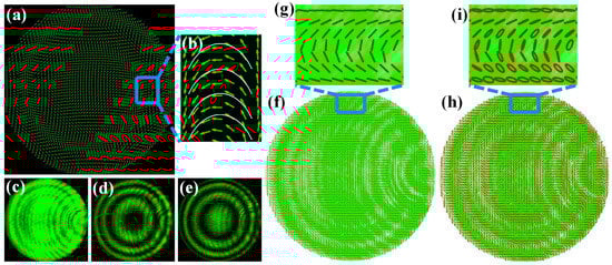 Generated vector beam with the desired phase profile δ1 of Equation (10). (a,b) The overall and local theoretical SOPs of the vector beam, respectively; (c–e) The intensity patterns of the vector beam after inserting no polarizer, horizontal polarizer and vertical polarizer, respectively; (f,g) The overall and local experimental SOPs with the linear components of the Stokes parameters of the vector beam, respectively; (h,i) The overall and local experimental SOPs with the full linear components of the Stokes parameters of the vector beam, respectively.