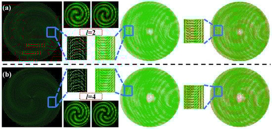 Generated vector beams with the desired phase profile δ2 of Equation (12). (a,b) Generated vector beams with topological charges of l = 2, and 4, respectively.