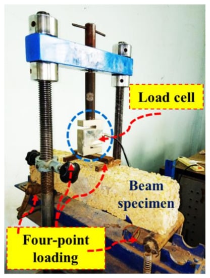 The structural performance of the PC was evaluated by checking its compressive strength and flexural strength behavior. According to IS: 516 [41], the compressive strength was performed using a cube of 150 mm × 150 mm × 150 mm. The cubes were prepared using the standard cube molds followed by IS:516 [41]. The loading rate during testing was kept as 4 tonne/mm. The flexure behavior of PC was calculated using beams of size 100 mm × 100 mm × 500 mm. A four-point loading system was used for this test, as shown in Figure 2, where the load was applied through a loading frame, and the failure load was recorded using a load cell.