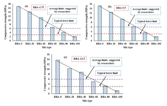 Compressive strength of PC mixes, (a) for RBA-4.75, (b) RBA-9.5, (c) RBA-12.5.