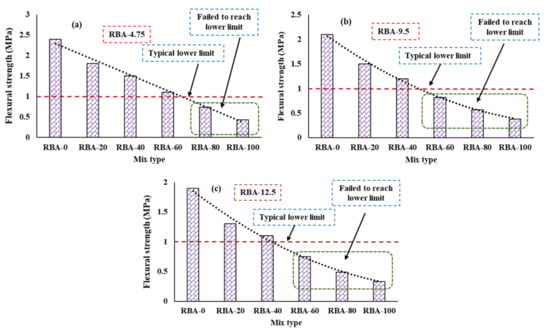 As pervious concretes are mostly used as paved sections, the flexural response also becomes essential. The flexural strength (fr) variations for different mixes are shown in Figure 5, where it is observed that the mixes produced with a higher percentage of RBA are not suitable to withstand a high flexural load. The variations of fr are somewhat similar to that of fcs due to the poor strength of RBAs. The path of flexural load transfer mostly propagates through the aggregates, and hence the weaker RBAs cannot take more loads. The typical lower limit of fr was suggested as 1 MPa [26,39], and it is found that the PC mixes made with 100% and 80% RBA cannot provide the minimum required value of fr for RBA-4.75. When the 4.75 mm aggregate is used for preparing PC mixes, fr values are obtained as 0.43 MPa, 0.74 MPa, 1.1 MPa, 1.5 MPa, 1.8 MPa, and 2.4 MPa for the mixes RBA-100, RBA-80, RBA-60, RBA-40, RBA-20, and RBA-0, respectively. However, for RBA-9.5 and RBA-12.5, 100% and 80% and 60% RBA usage are not useful for obtaining a limit value of flexural strength. The aggregate size of 9.5 mm fr values are obtained as 0.38 MPa, 0.57 MPa, 0.82 MPa, 1.2 MPa, 1.5 MPa, and 2.1 MPa for the mixes RBA-100, RBA-80, RBA-60, RBA-40, RBA-20, and RBA-0, respectively. Similarly, the aggregate size of 12.5 mm fr values are obtained as 0.33 MPa, 0.49 MPa, 0.75 MPa, 1.1 MPa, 1.3 MPa, and 1.9 MPa for the mixes RBA-100, RBA-80, RBA-60, RBA-40, RBA-20, and RBA-0, respectively. Another important thing that can be noticed here is that the value of fr is higher for smaller aggregates compared to larger aggregates, which is primarily happening due to the presence of smaller pore sizes. The gap between two large aggregates is much higher than the gap between two small aggregates, and hence the crack propagation in the mixes with larger aggregates becomes much easier.