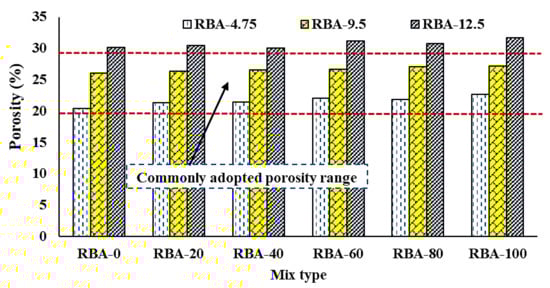 A suitable porous structure and sufficient amount of voids are the key factors of PCs as an adequate water percolation rate can only be achieved due to the presence of these voids. In this study, the porous nature is checked in two ways: (a) porosity measurement and (b) stereological analysis through IPT. The experimental porosity results are shown in Figure 6, where it can be found that the effect of RBAs on the change of porosity values is very little as the porosity value is slightly increasing with the increase in RBA content. It was observed from the literature that the porosity of PC mixes ranges from 15–30%, and here all the mixes show a porosity range of 20% to 30%, which is quite satisfactory. However, the difference in porosity values is much more prominent if the size of aggregates is changed. For an aggregate size of 4.75 mm, the porosity lies in the range of 20–22%, increasing up to 26–27% if a 9.5 mm size aggregate is used. Similarly, the porosity values can be achieved up to 32% if the aggregate size is kept at 12.5 mm. Such varying porosity is common because of the production of different sizes of pores in PC mixes when varying aggregates are used.